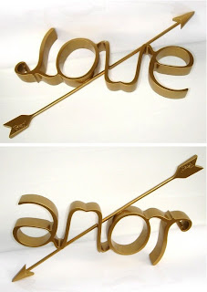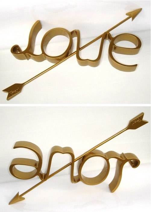 Here we see that love and amor are two sides of the same ambiguous object. This sculpture represents an “ambigram.” Judith Bagai, editor of The Enigma, the official journal of The National Puzzlers' League, coined the term by contracting the words "ambiguous" and "anagram" (the original ambigrams were represented by the same word in both directions).